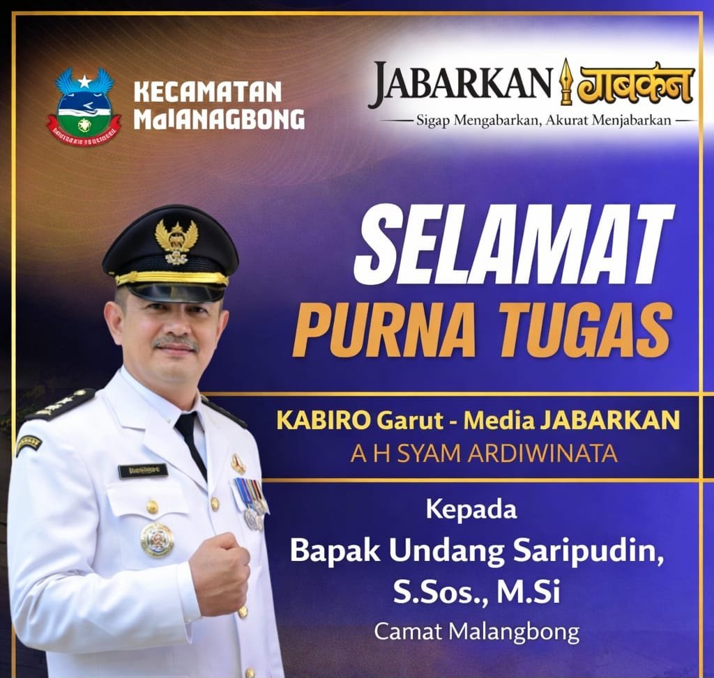 “Kami dari Media Jabarkan mengucapkan selamat purna tugas kepada Bapak Undang Saripudin. Terima kasih atas dedikasi dan pengabdian yang telah diberikan untuk masyarakat Malangbong,” ujar A H Syam Ardiwinata.