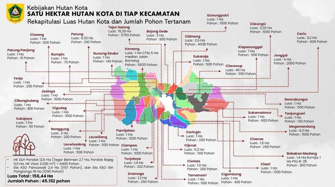 BOGOR, 17 April 2026 — Pemerintah Kabupaten Bogor mempercepat pembangunan hutan kota melalui program penanaman pohon masif sejak awal 2026. Dalam empat bulan, luas hutan kota mencapai 156,44 hektare dengan 45.152 pohon tertanam sebagai upaya menghadapi perubahan iklim dan memperkuat ketahanan lingkungan daerah.